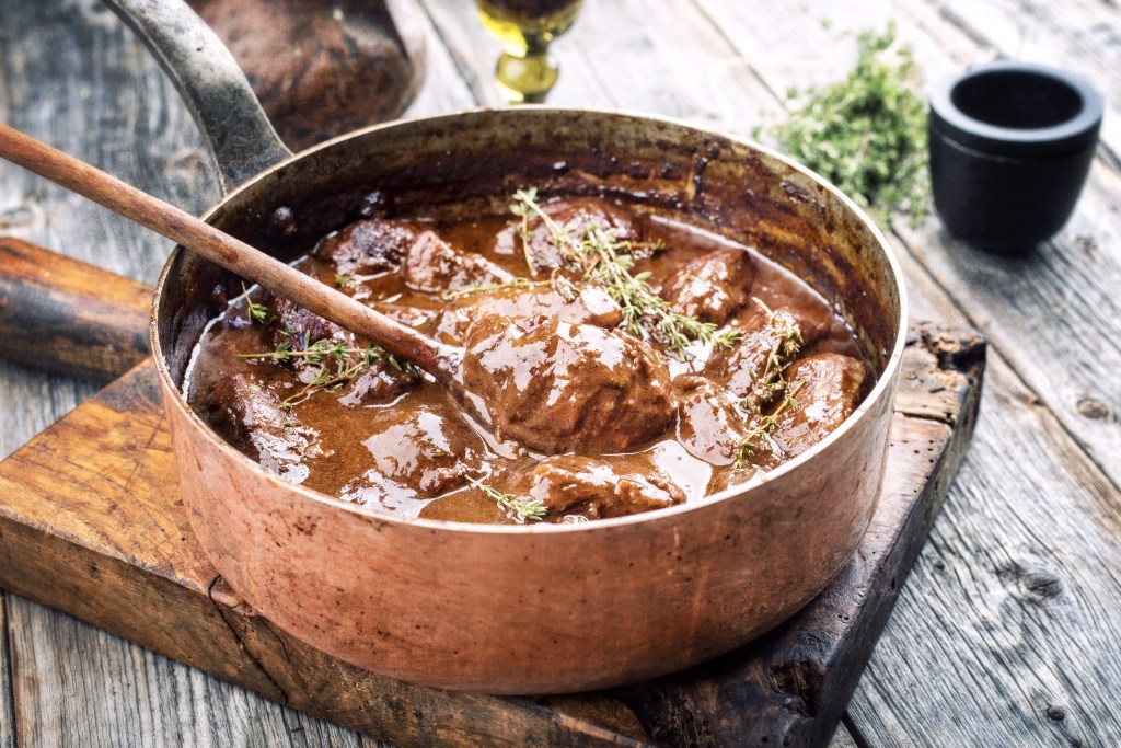 • Dans une grande cocotte, faire dorer les morceaux de viande dans un peu d’huile. Réserver.